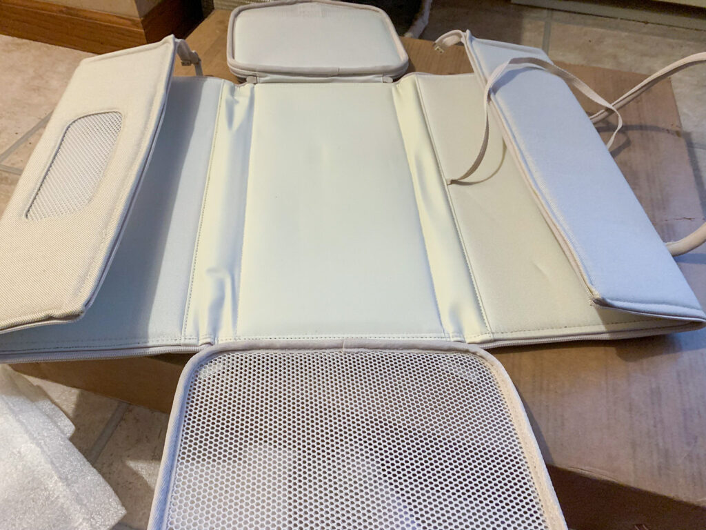 The faux shearling mat inside is removable and super soft. When the carrier is zipped up, the bed folds neatly and secures with Velcro.